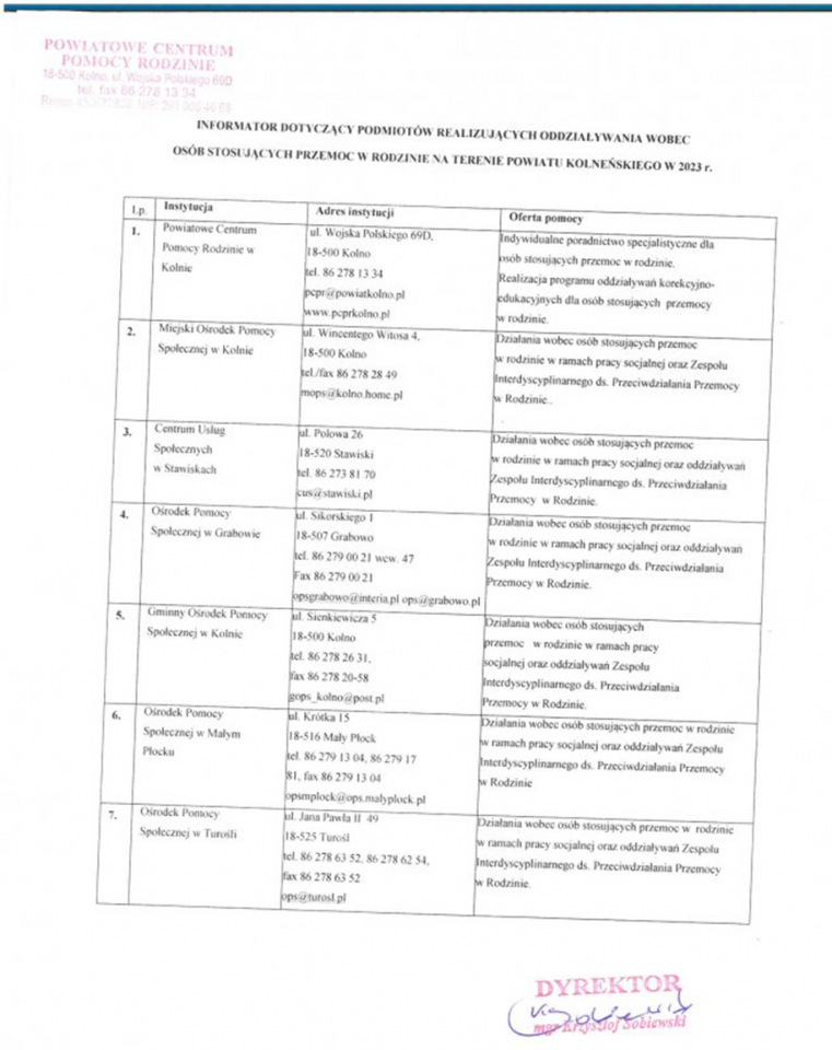 - opracowanie i realizacja planu pomocy w indywidualnych przypadkach wystąpienia przemocy w rodzinie,